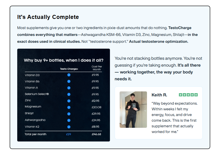 That’s when I first saw TestoCharge mentioned, an all-in-one formula for men, packed with the exact nutrients I had just read about.
